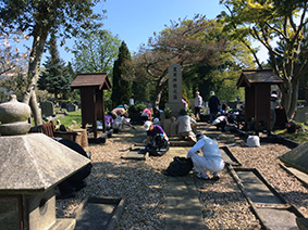 好天に恵まれた4月20日(気温 22.7度)恒例の清掃、供養が行われました。11時前から清掃開始、故名列記のボードや、墓石を、心込めて磨かれる方々、雑草取り、溜まった落ち葉をかたずける方達、お花を持参して活けてくださる方、其々皆さんで清掃に励みました。