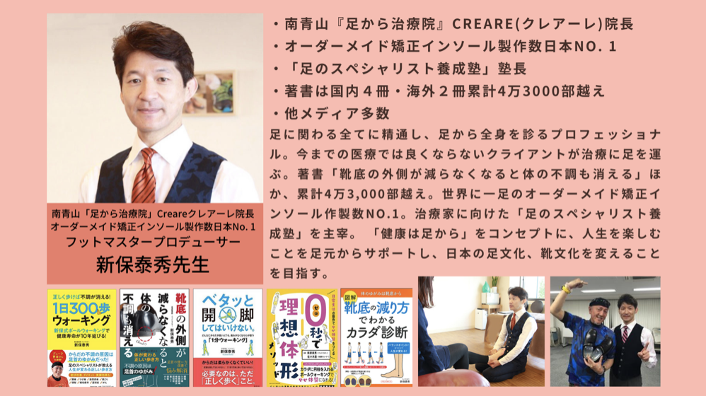 プロファイル:新保 泰秀(Yasuhide Shinbo) 足首を3回手術した経験から、足首は必ず歪み お身体の不調の原因は足元である事に気付く。足から治す一人治療家として延べクライアント数は13万人を超え、世界にたった1つオーダーメイド矯正インソール作製数日本一。『健康とは人生を楽しむこと』をポリシーとし、全国の治療家が集うフットマスター養成塾の塾長として地域No.1治療院を輩出する。日本の足文化を変えるため フットマスターという職業を創る。国内外にて 書籍・TVやメディア出演多数。